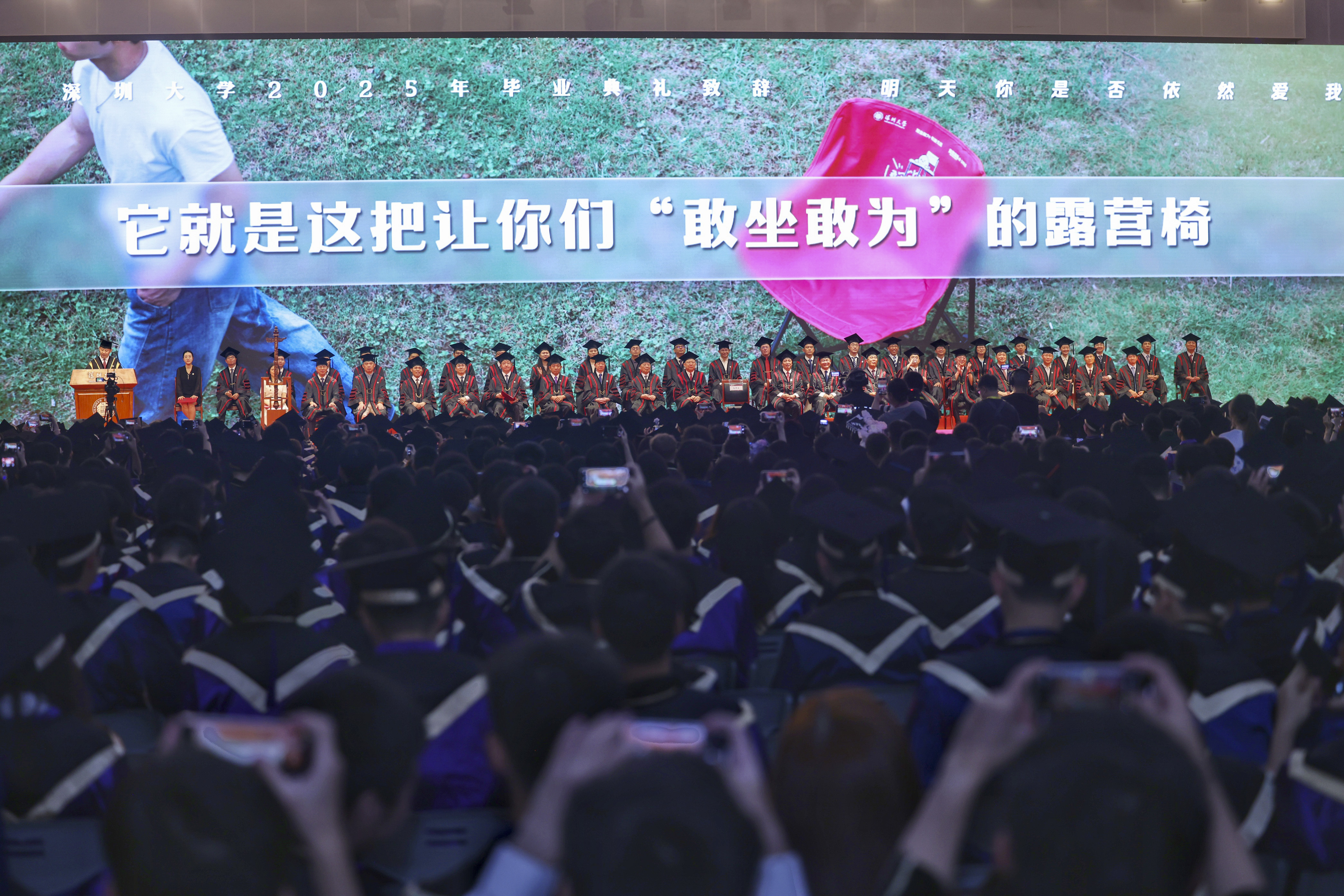 6月20日,深圳大学 2025年毕业典礼在该校元平体育馆举行,一年一度的毕业礼物再度成为焦点。从前年的 “追梦探梦枕头”,到去年的“启程奔赴饭盒”,今年深大以一把“敢坐敢为” 露营椅续写温情与创意,用实物隐喻诠释 “在人生席位中敢闯敢为”的成长命题。>">奋进人生>>